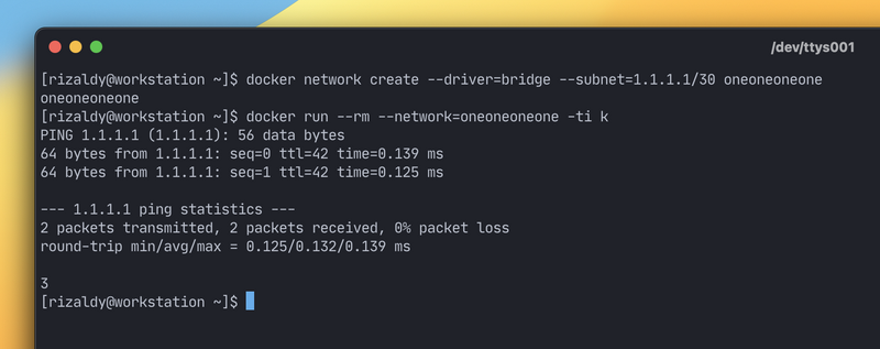 , yang intinya hanya ada 2 alamat IP yang bisa digunakan oleh jaringan tersebut (1.1.1.1 dan 1.1.1.2). Container tempat menjalankan program k