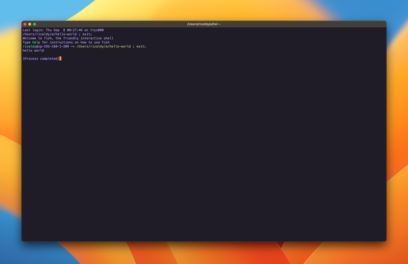 Disitu terlihat bahwa komputer gue membuka sebuah program bernama Terminal dan lalu tulisan "hello world" muncul di program tersebut.