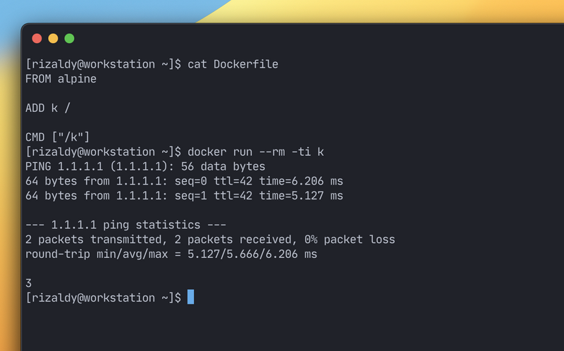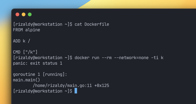 Sekarang gue akan mencoba untuk menjalankan program tersebut berjalan sebagai container. Disini gue akan menggunakan Alpine Linux sebagai base OS nya (contoh sebelumnya scratch)