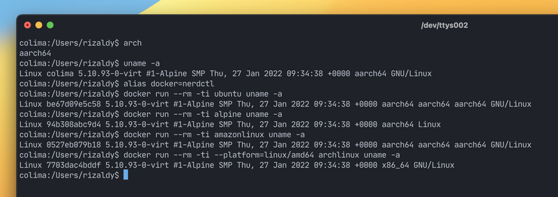 Personally gue pakai colima di Mac OS yang mana dia membuat linux-based VM yakni Alpine Linux yang menjalankan CRI (the CRI daemon, gue menggunakan containerd langsung) disana (VM).