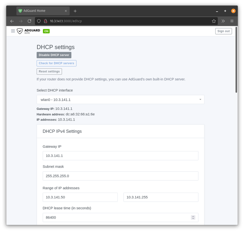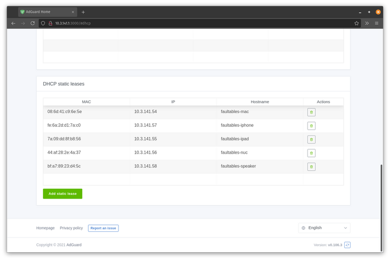 Subnet yang gue pilih adalah 10.3.141.0/24 karena kenapa tidak dan gue tidak menggunakan dnsmasq(8) melainkan AdGuardHome karena dia juga bisa bertindak sebagai DHCP server. Serta, kalau gue pakai dnsmasq, dns queries diforward dari router ke... router. Jadi, kalau si 10.3.141.6 pakai nameserver router, si AdGuardHome taunya kalau yang melakukan query itu adalah si router itu sendiri bukan dari klien.