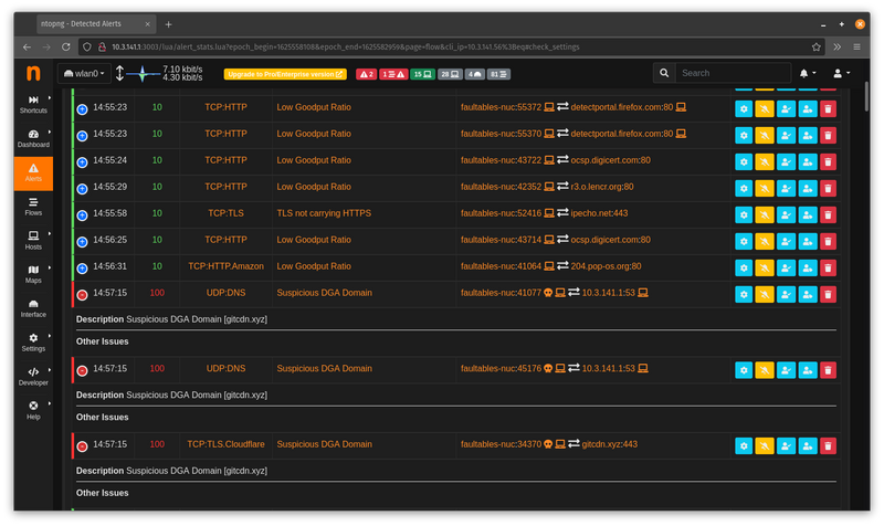 Karena ntop adalah Traffic Analyzer, jadi dia pun menganalisa paket apa yang sekiranya dianggap berbahaya ataupun butuh perhatian. Misal ini, gue dapet alert kalau ada paket yang diduga "malicious" dengan kategori Suspicious DGA: