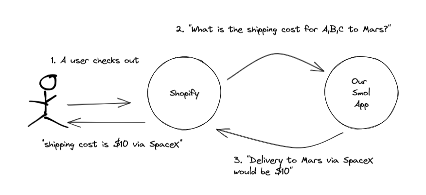 Shopify has lots of ways to enhance a store capability. For this exercise, I am using their CarrierService thingy. In short, Shopify will issue a callback to an endpoint with some order informations everytime a user checks out. Our job here is to respond with shipping rate(s) information.